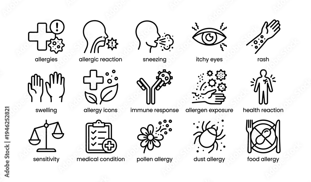 Naklejka na ściany i meble - Allergy icons collection: allergic reaction, sneezing, itchy eyes, rash, swelling.
