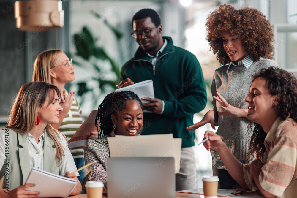 Naklejka na ściany i meble - Diverse business team collaborating during office meeting.