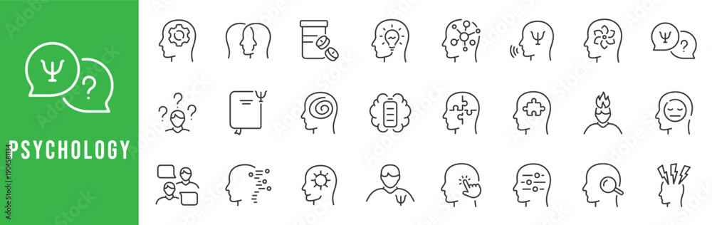 Naklejka na ściany i meble - Outline psychology icon set illustrating mental health, therapy, cognition, emotions, and behavioral analysis.