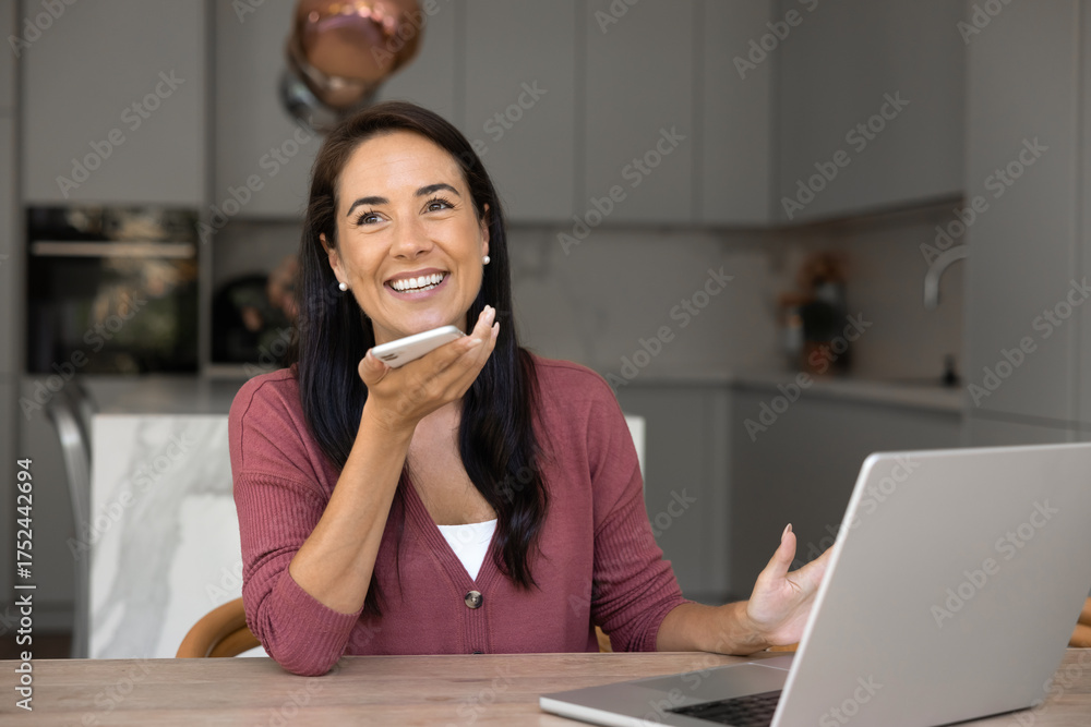 Naklejka na ściany i meble - Happy beautiful Latin manager woman talking on cell on speaker.