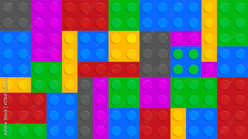 Naklejka na ściany i meble - Colored plastic construction plate with black circles, geometric circle colorful wallpaper, seamless modern design abstract background, closeup plastic toy block.