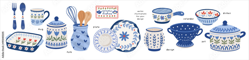 Naklejka na ściany i meble - Folk ceramic dishes. Cute vector hand-drawn rustic illustrations of dishes, plate, saucepan, jugs, pot, mug, cup, fork, spoon and kitchen utensils, blu floral pattern, ornament for home decor and i.