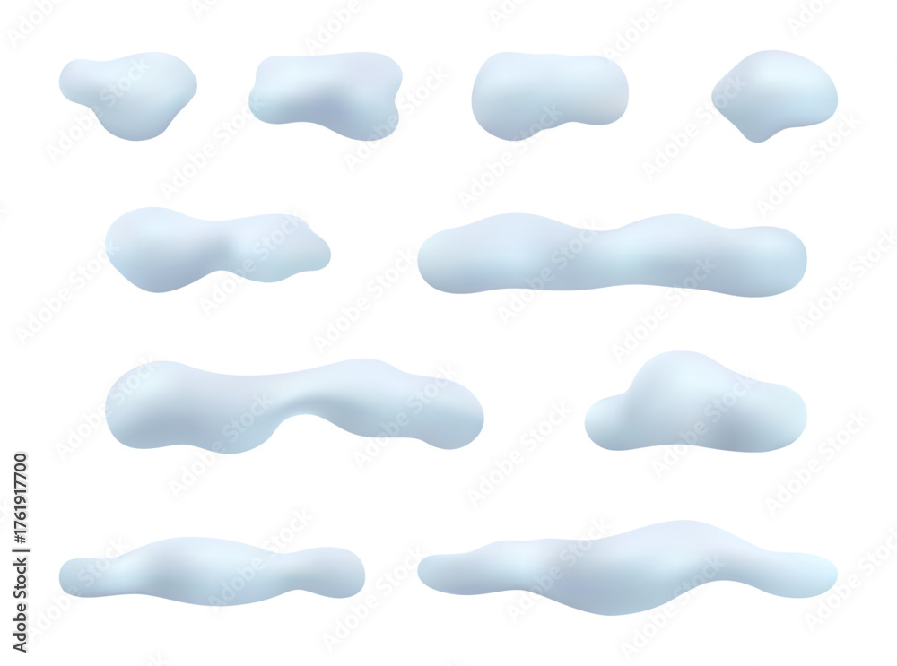 Naklejka na ściany i meble - Winter weather, snowy piles with frozen icy design. Vector realistic icons set, snow caps and balls, xmas and Christmas peak or summit decoration, wintertime and seasonal blizzard. Snowcaps.