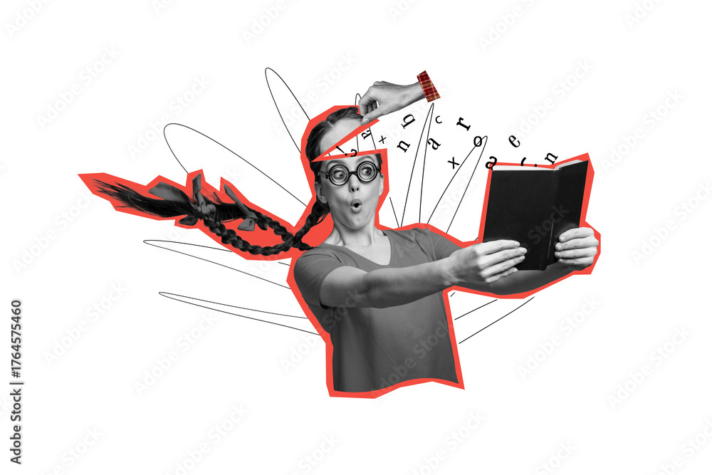 Naklejka na ściany i meble - Photo collage young amazed woman bookreader nerd exam preparation education day student head caricature letters become smarter.