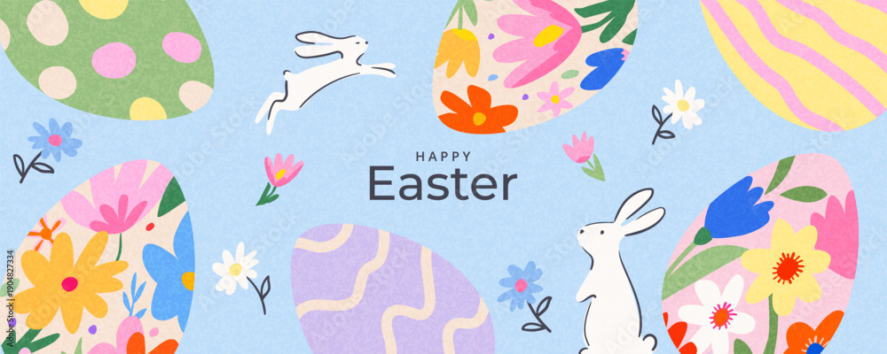 Naklejka na ściany i meble - Happy Easter banner, horizontal poster, greeting card, header for website. Trendy Easter design with typography, hand drawn pattern with Easter eggs, spring flowers and Easter bunny. Modern art style..