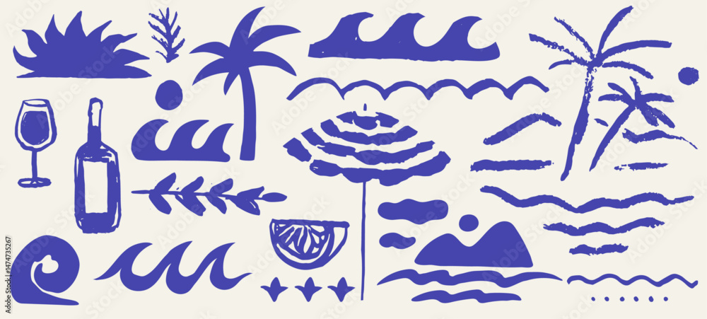 >Naklejki na ściany i meble>Wybrane motywy - zobacz więcej !>Wodospad>Italian greek style vacation hand drawn vector illustrations in grunge scribble rough doodle sketch style elements. Wave, surf, palm tree vacation in chalk charcoal style. Drawings for poster, placard