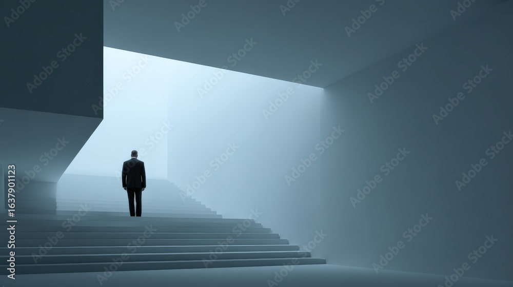 Naklejka na ściany i meble - Businessman Ascending Staircase Towards Light: Vision, Ambition, and Opportunity in a Modern Architectural Space.