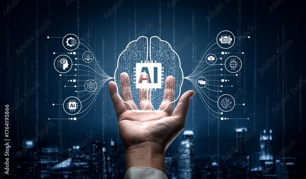 Naklejka na ściany i meble - AI assistant with LLM, big data, machine learning, and generative AI powers prompt engineering and supports agentic AI for advanced business applications. Vouch.
