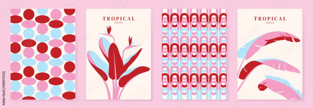 Naklejka na ściany i meble - Summer tropical poster set vector. Midcentury modern bird of paradise flower, abstract oval pattern, retro arch geometric background and botanical leaf wall art in pink, red and light blue..