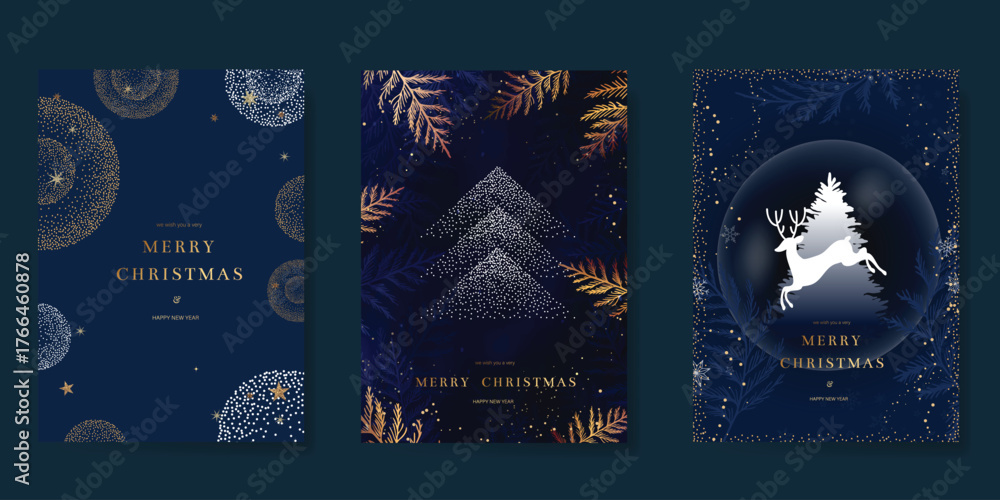 >Naklejki na ściany i meble>Wybrane motywy - zobacz więcej !>Zebra>Christmas and Happy Holidays card vector set. Luxury gold victorian frame, leaves branch, flower, star, snowflake on navy blue background. Design illustration for poster, cover, invitation, ads.