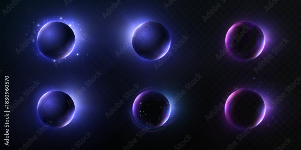 Naklejka na ściany i meble - Bright, glowing circles, spheres, and energy rings with backlighting and an internal glow of purple-blue hues. Vector circles and portals for HUD interfaces, game design, and futuristic overlays.