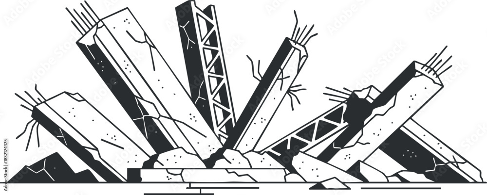 Naklejka na ściany i meble - A collection of concrete debris and wreckage in black and white vector style, suitable for construction and demolition themes.