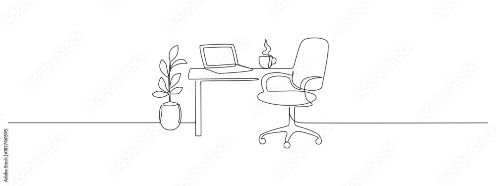 Naklejka na ściany i meble - One continuous line drawing captures a modern office interior with desk, chair, and workspace details in minimalist sketch art style for creative home design projects. Doodle vector illustration.