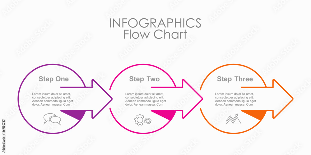 Naklejka na ściany i meble - Three-step infographic flow chart with icons and arrows for visualizing processes, workflows, or timelines..