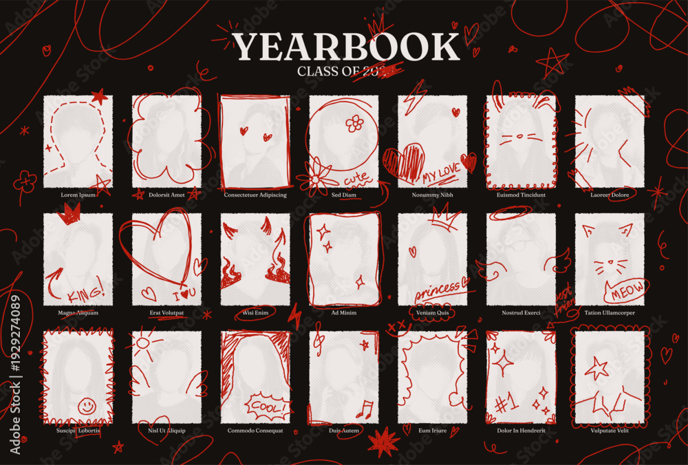 >Naklejki na ściany i meble>Wybrane motywy - zobacz więcej !>Zebra>Graduation yearbook template with hand drawn doodles on photos. School album layout design, graduating class portrait pictures with funny pen scribbles, college graduation ceremony photo vector mockup