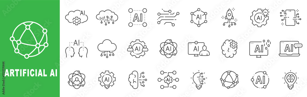 Naklejka na ściany i meble - Artificial intelligence AI outline icon set featuring machine learning, neural network, brain, cloud computing, automation technology concepts data analytics innovation.