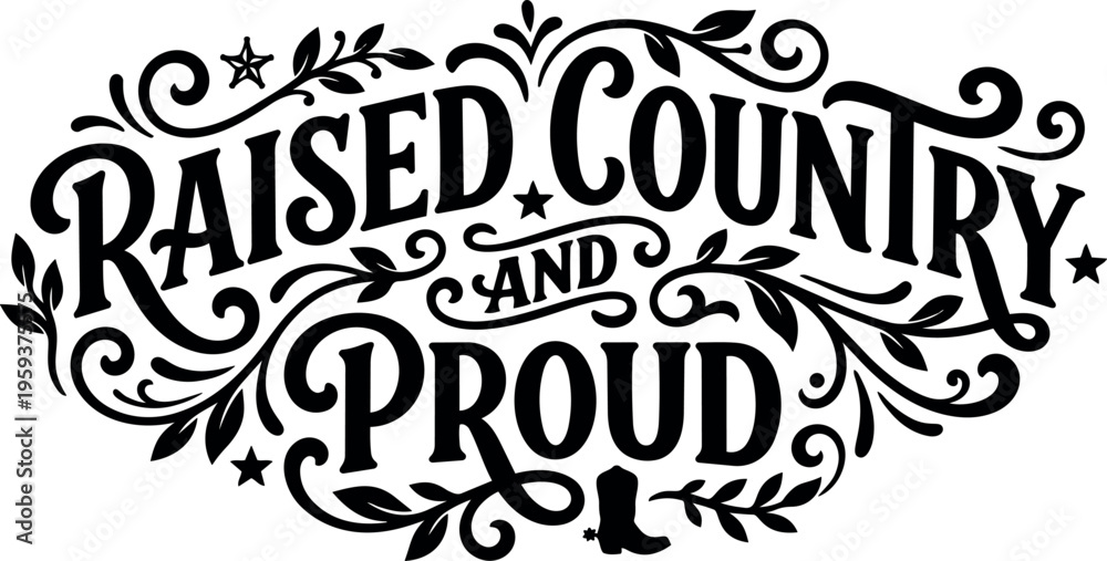 Naklejka na ściany i meble - Raised country and proud black and white lettering with boot and floral swirls.