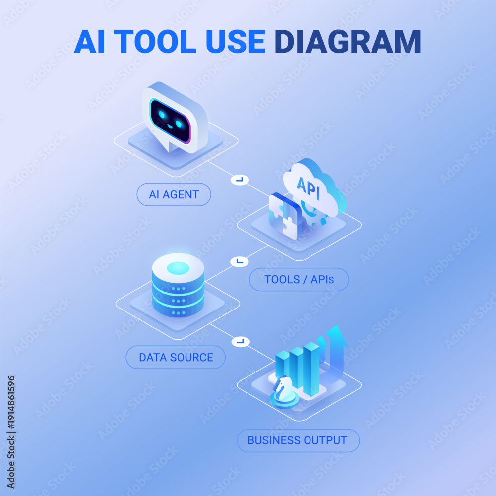 Naklejka na ściany i meble - AI Tool Use Diagram - isometric infographics technology vector - AI agent interacts with tools, APIs, and data sources to produce business outcomes - workflow infographic for enterprise presentations.