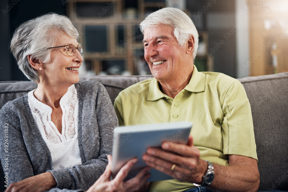 Naklejka na ściany i meble - Senior, happy couple and sofa with tablet in home for research, online news or browsing app. Elderly, man and woman with smile on technology for web entertainment, platform or games on couch in house.