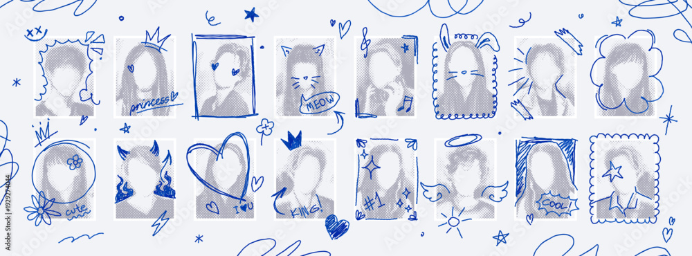 Naklejka na ściany i meble - Photocard collage template with hand drawn doodles on photos, graduation yearbook layout. Graduating class school album pictures with pen scribbles, college graduation ceremony photo vector mockup.