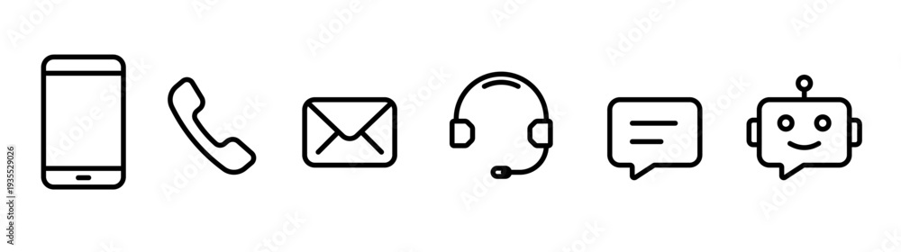 Naklejka na ściany i meble - Contact and Customer Support icons Set, Digital Assistance Black Line Symbols For Phone, Live Chat, Email, Mobile and AI Chatbot Vector on White Background.