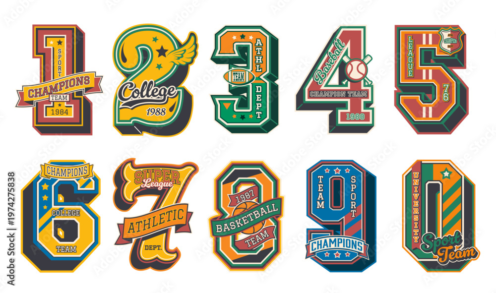 Naklejka na ściany i meble - Varsity sport patch labels decorated with athletic champion, basketball, baseball, football and university sport, wings, stars, ribbons and team badges. Vector retro patch sign for school and college.