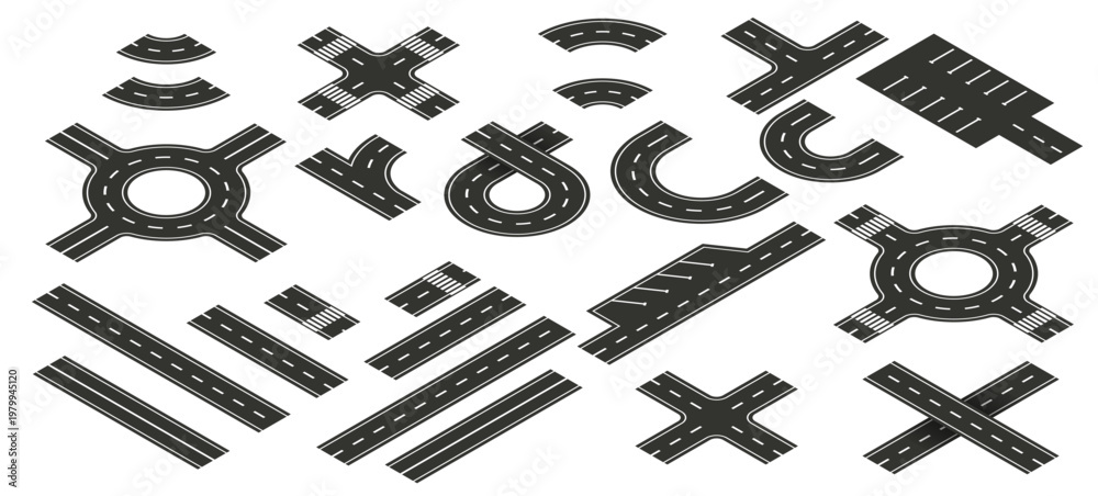 Naklejka na ściany i meble - Isometric road vector elements for city map creation. Set of objects for highway journey map, path asphalt lines traffic circle car direction. Streets and roads with crossroad, footpath.