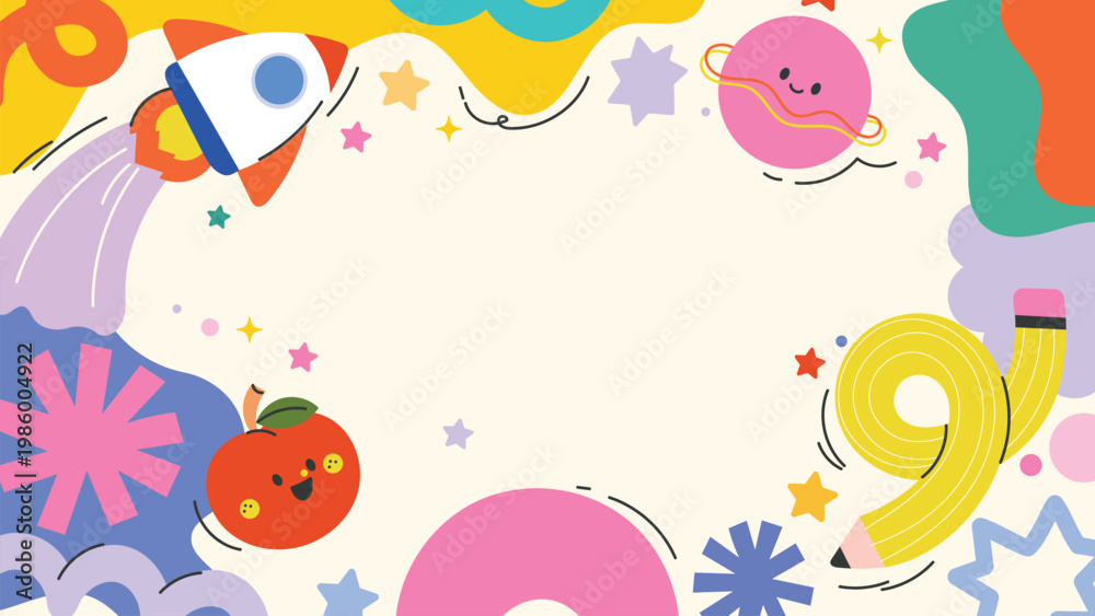 Naklejka na ściany i meble - Cute colorful kids hand drawn doodle background frame design vector with rocket, planet, rainbow pencil, smiling orange and stars. Design for 4K video template, banner, back to school and education ad.
