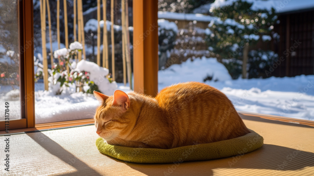 Naklejka na ściany i meble - Cozy orange cat lounging in sunlit room with snow-covered garden view through large glass windows on a winter day.