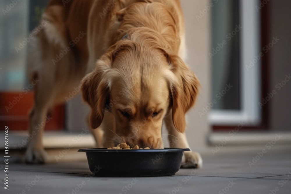 Naklejka na ściany i meble - Golden retriever enjoying a meal from a bowl on the floor in a cozy home environment, showcasing the bond between pets and their owners, pet care concept.
