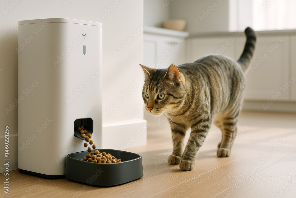 Naklejka na ściany i meble - Smart pet feeder with food on the floor in a modern kitchen as a cat approaches to eat..