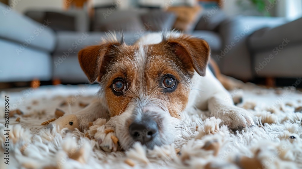 Naklejka na ściany i meble - A cute dog with expressive eyes rests on a fluffy rug in a cozy living room, illustrating the warmth and companionship of pets in domestic settings..