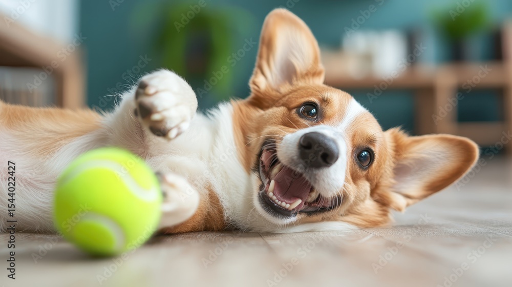 Naklejka na ściany i meble - A joyful corgi lies on the floor, engaging with a vibrant green tennis ball, showcasing the playful spirit and happiness of pets in a cozy home environment..