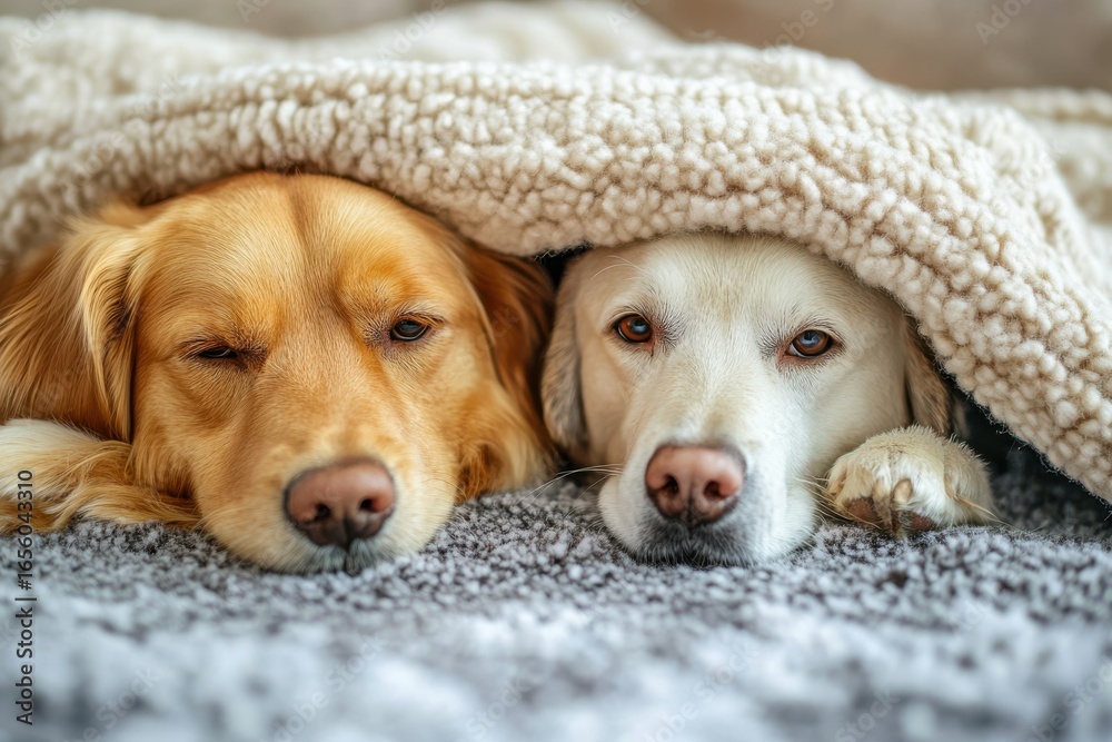 Naklejka na ściany i meble - Two dogs resting under a cozy blanket.