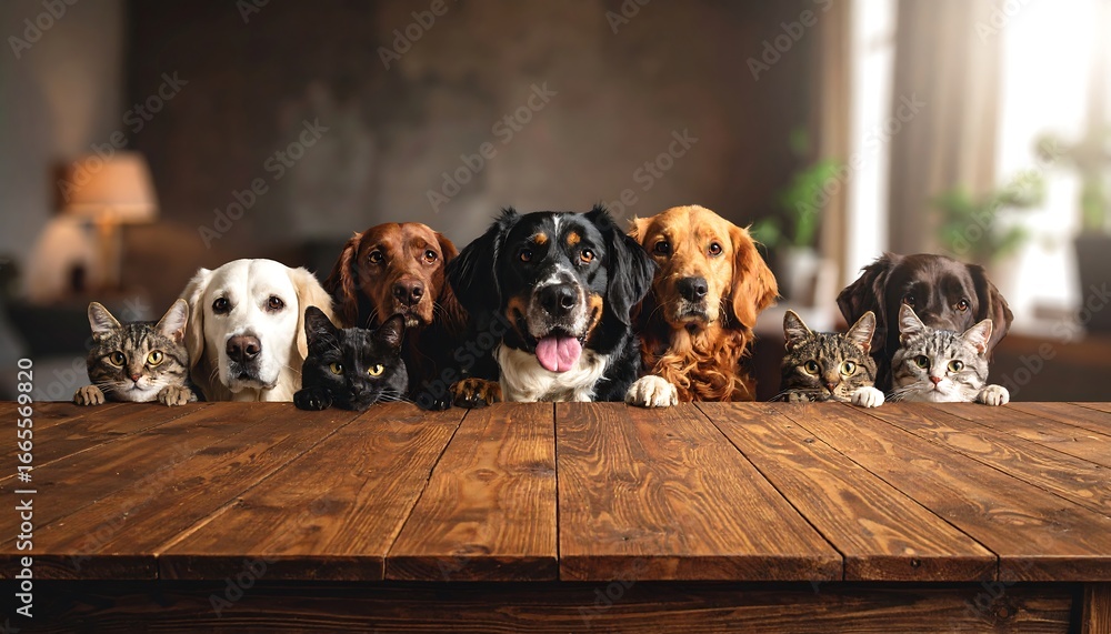 Naklejka na ściany i meble - Adorable pets of various breeds gathered together, peering over a rustic wooden table, creating a warm and inviting scene..