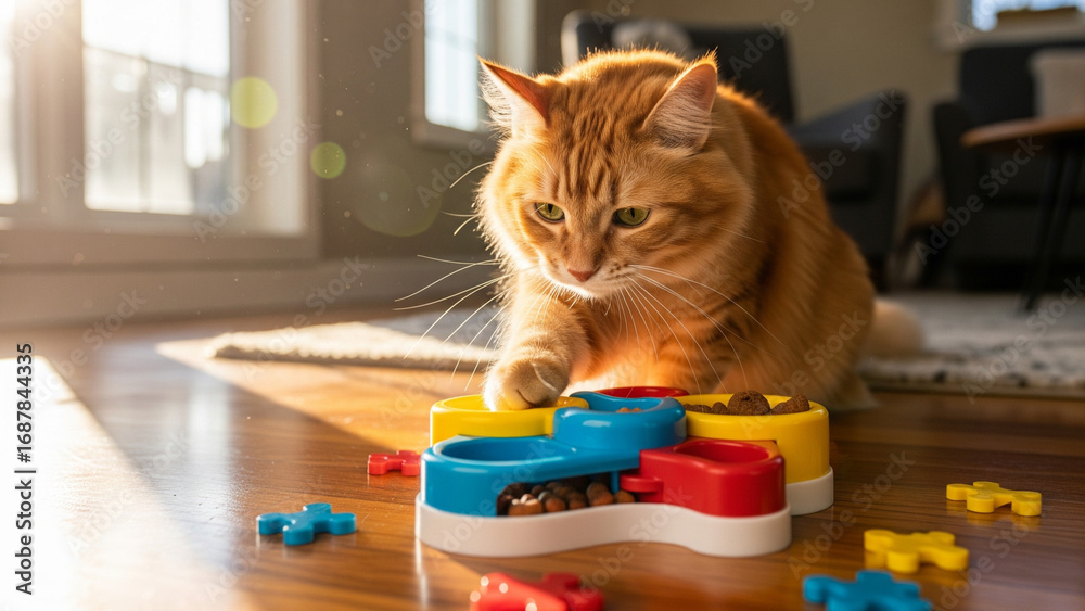 Naklejka na ściany i meble - Orange tabby cat playing with a colorful puzzle feeder toy on a wooden floor..