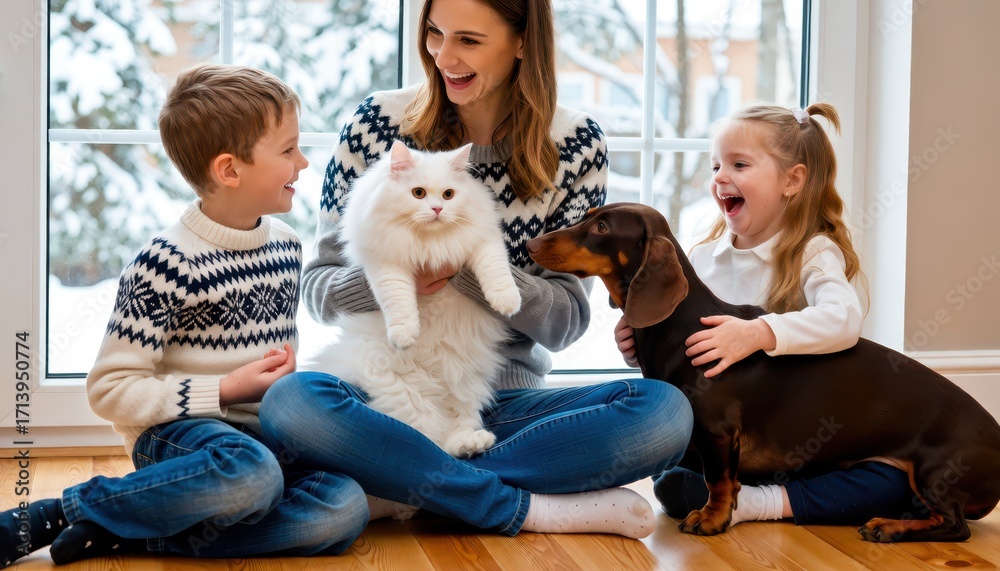 Naklejka na ściany i meble - Family fun with pets indoors living room lifestyle photography cozy winter environment joyful interaction.
