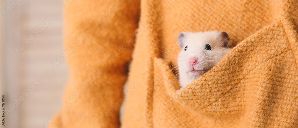 Naklejka na ściany i meble - Owner with cute funny hamster in pocket, closeup.