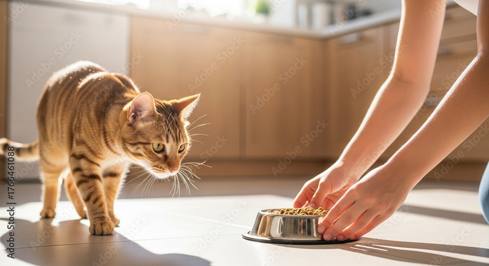 Naklejka na ściany i meble - Girl feeding cat from bowl in sunny kitchen, pet care and nutrition.