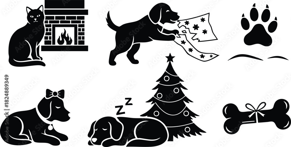 Naklejka na ściany i meble - Black silhouette icons of pets with christmas tree fireplace and bone.