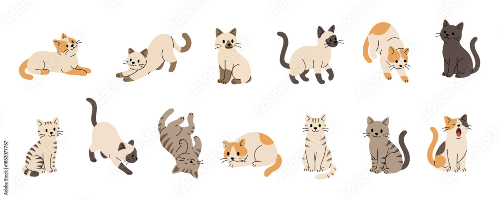 Naklejka na ściany i meble - Cute cartoon cats in different poses and colors. Flat vector illustration of playful kittens for children, pet themes and animal designs.