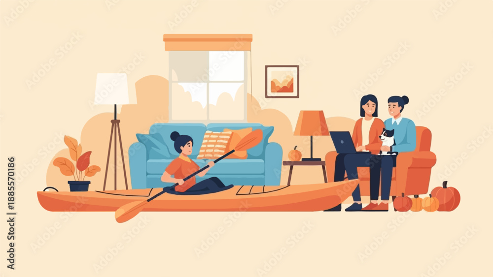 Naklejka na ściany i meble - Cozy autumn indoor scene with kayaking, laptop use, and pets.