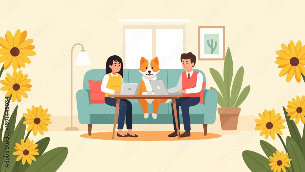 Naklejka na ściany i meble - Cozy home scene with two people and a dog working on laptops.