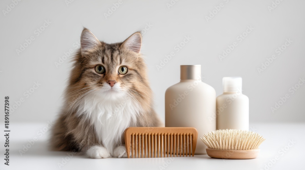 Naklejka na ściany i meble - Cat sitting beside grooming tools including a comb and shampoo bottles for pets on a clean white surface with soft lighting and minimalistic background.