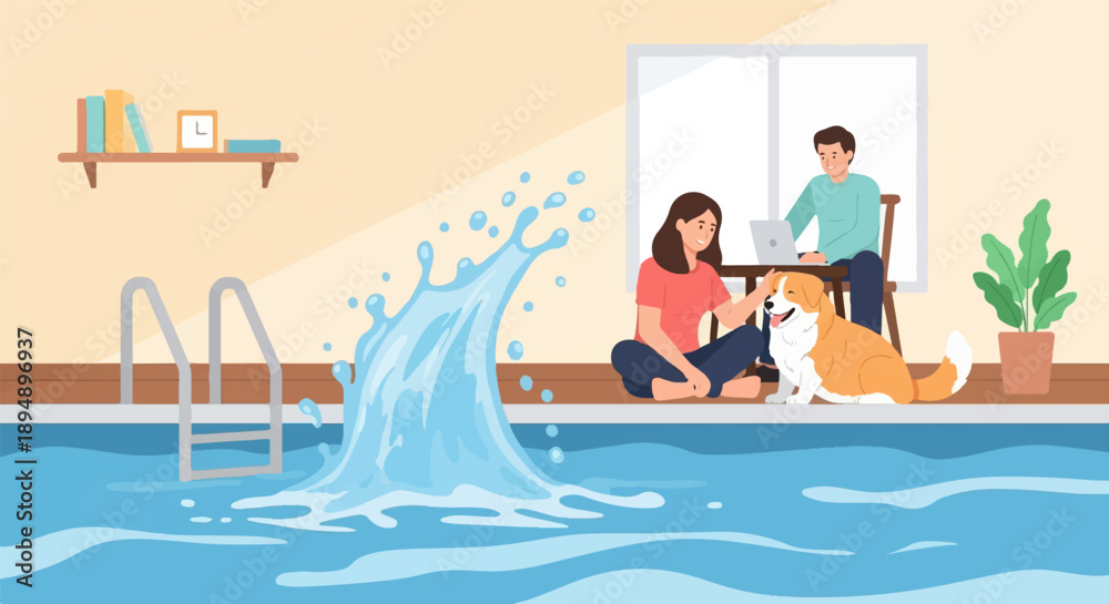 Naklejka na ściany i meble - A woman pets a dog near a pool while a man works on a laptop.
