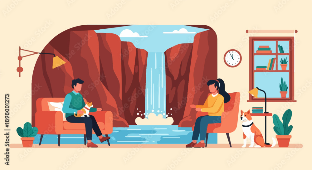 Naklejka na ściany i meble - People and pets relax indoors with a stunning waterfall view.