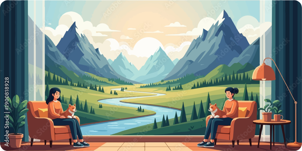 Naklejka na ściany i meble - Two women and their dogs relax indoors with a scenic mountain valley view.
