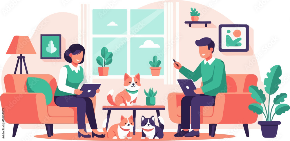 Naklejka na ściany i meble - Cozy home scene with people and pets working, plants, and a large window view.