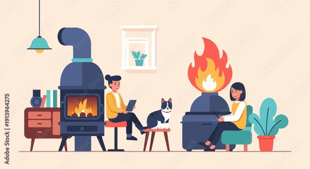Naklejka na ściany i meble - Two people and a cat relax by a fireplace and a grill indoors.