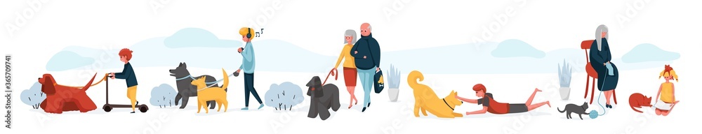 Naklejka na ściany i meble - People and pets at home. Cartoon young people playing with their home animals, people with cats and dogs communicating. Vector illustration concept happy human communicating with pets.